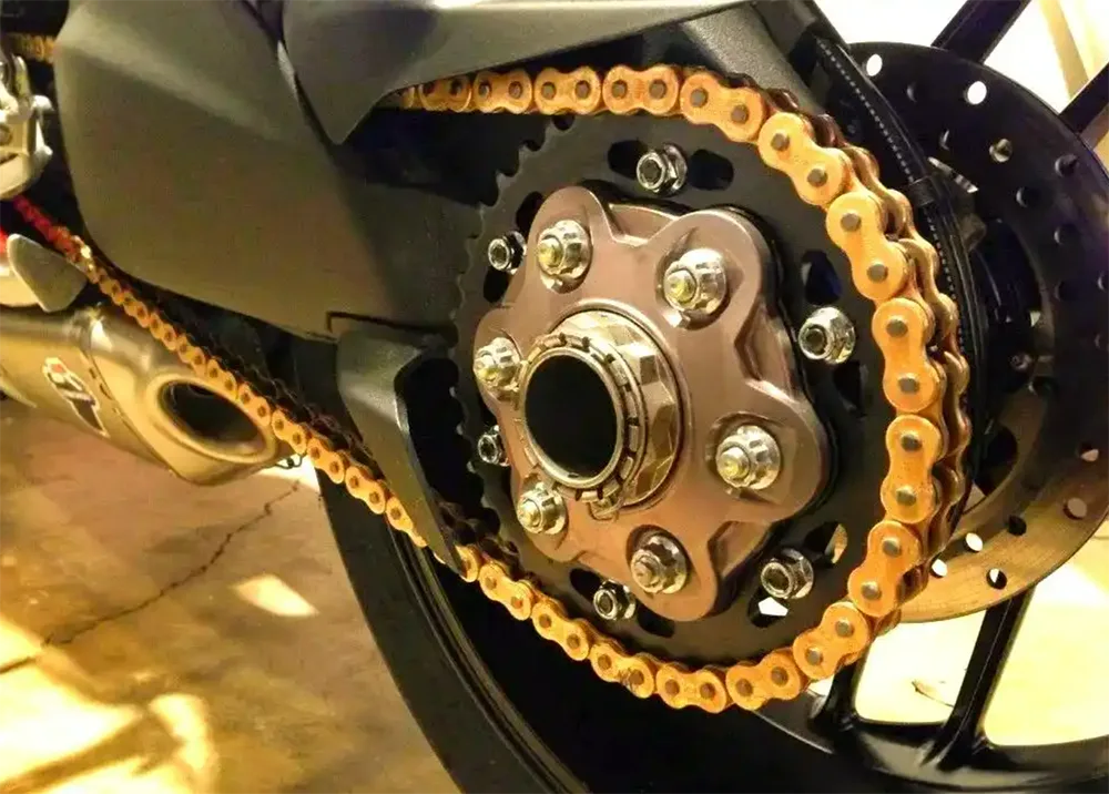 Printre schemele de transmisie a puterii multor motociclete, sistemul de transmisie a lanțului și pinionului a devenit alegerea preferată pentru multe motociclete datorită caracteristicilor simple și eficiente. Are o eficiență ridicată a transmisiei și o greutate generală generală, în special potrivită pentru tipurile de vehicule care necesită un cuplu ridicat. Cu toate acestea, are și anumite limitări, cum ar fi uzura și zgomotul în timpul funcționării. În timpul procesului de transmitere a puterii motorului către roțile din spate, se pot obține amplificarea cuplului și reglarea raportului de reducere prin reglarea raportului dinților din angrenajele din față și din spate.
